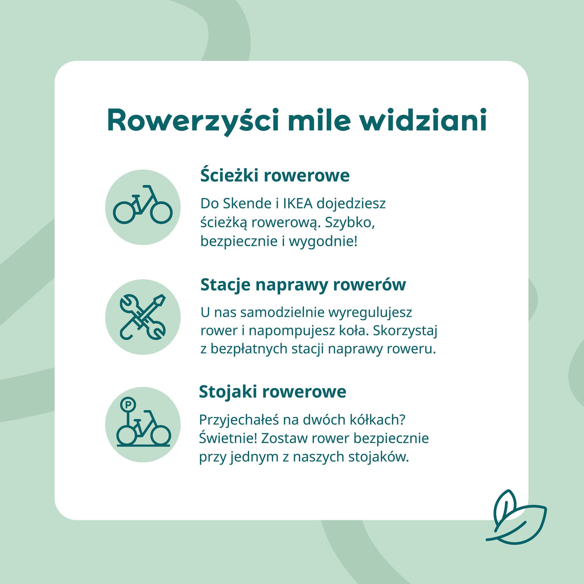 Wspieramy zrównoważony transport i pokazujemy, jak łatwo korzystać z niego na co dzień – również odwiedzając Skende i IKEA! Poniżej znajdziesz kilka udogodnień, które przygotowaliśmy dla klientów wybierających rower, komunikację miejską czy carpooling.