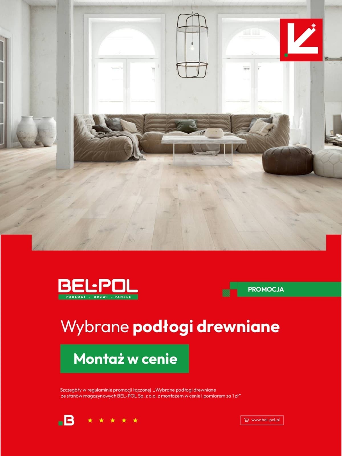 *Szczegóły w regulaminie promocji łączonej „Wybrane podłogi drewniane ze stanów magazynowych BEL-POL Sp. z o.o. z montażem w cenie i pomiarem za 1 zł”