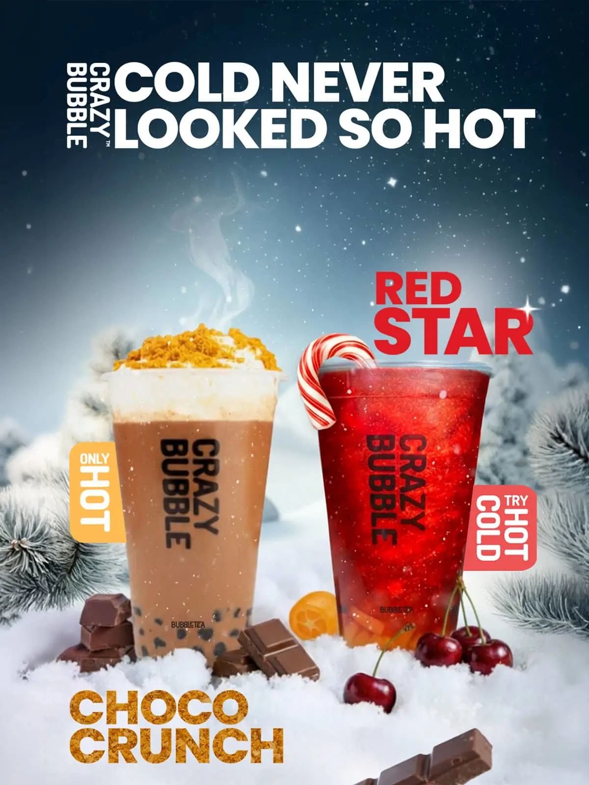 Zimowa oferta Crazy Bubble to idealne połączenie rozgrzewających smaków i zimowej świeżości. Spróbuj Choco Crunch na gorąco albo Red Star – na ciepło lub na zimno.