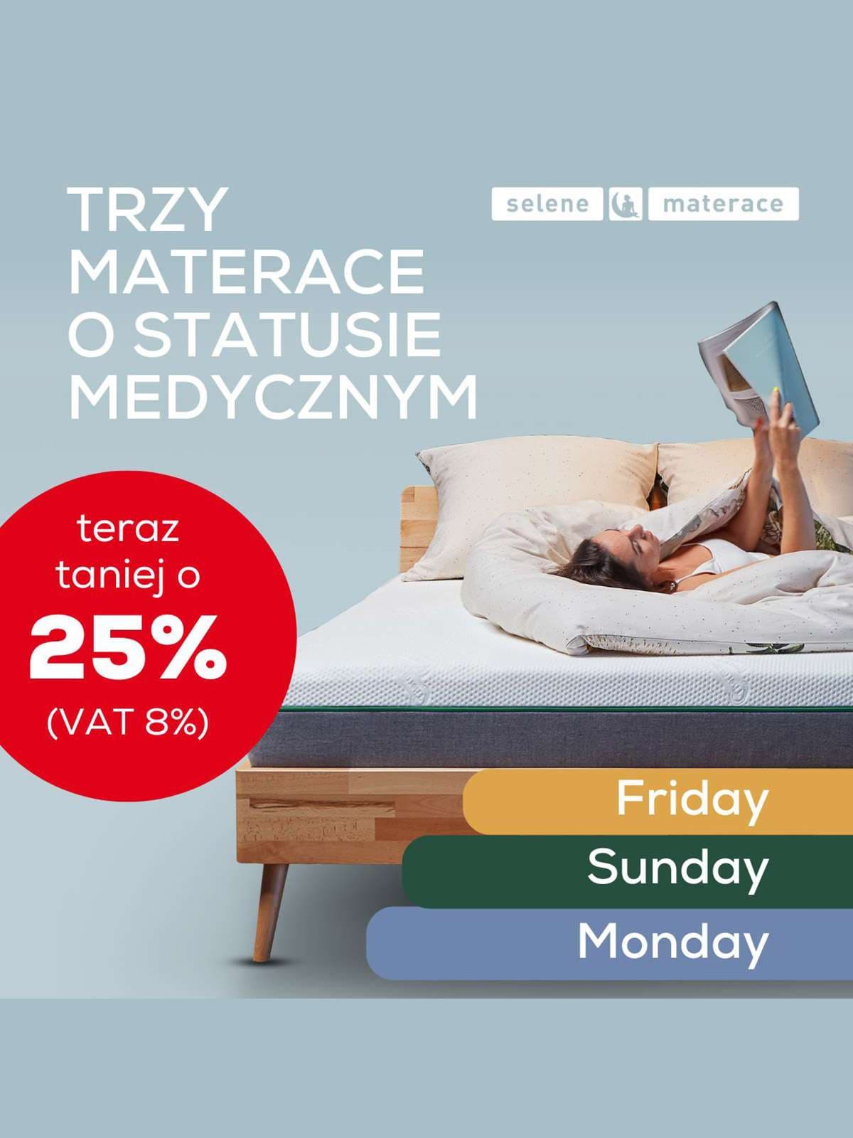 Nasze materace o statusie medycznym - Monday, Friday, Sunday - tylko teraz możecie mieć aż o 25% taniej! Ich cena zawiera 8% stawkę Vat.