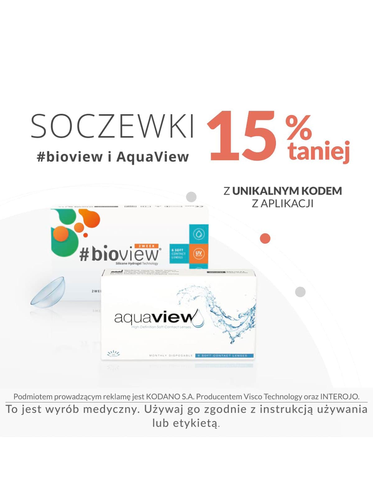 Z kodem z naszej aplikacji KODANO otrzymasz 15% rabatu na soczewki #Bioview i #Aquaview!