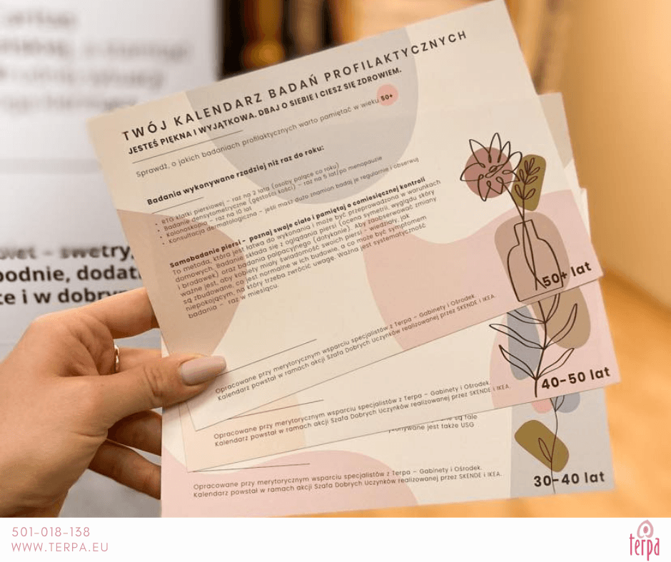 Wspólnie ze specjalistami z Terpa – Ośrodek i Gabinety przygotowaliśmy kalendarze badań profilaktycznych dla kobiet w wieku - od 20 lat do 50+. Kalendarz ma uniwersalny rozmiar, więc możesz go wkleić do swojego terminarza notatnika lub postawić na toaletce - tak, abyś regularnie mogła na niego spoglądać. Znajdziesz tam miejsce do zaznaczania comiesięcznego samobadania piersi i inne ważne wizyty lekarskie, które warto odbyć w ciągu roku i częściej. Kalendarz znajdziesz w pasażu SKENDE na specjalnym standzie.