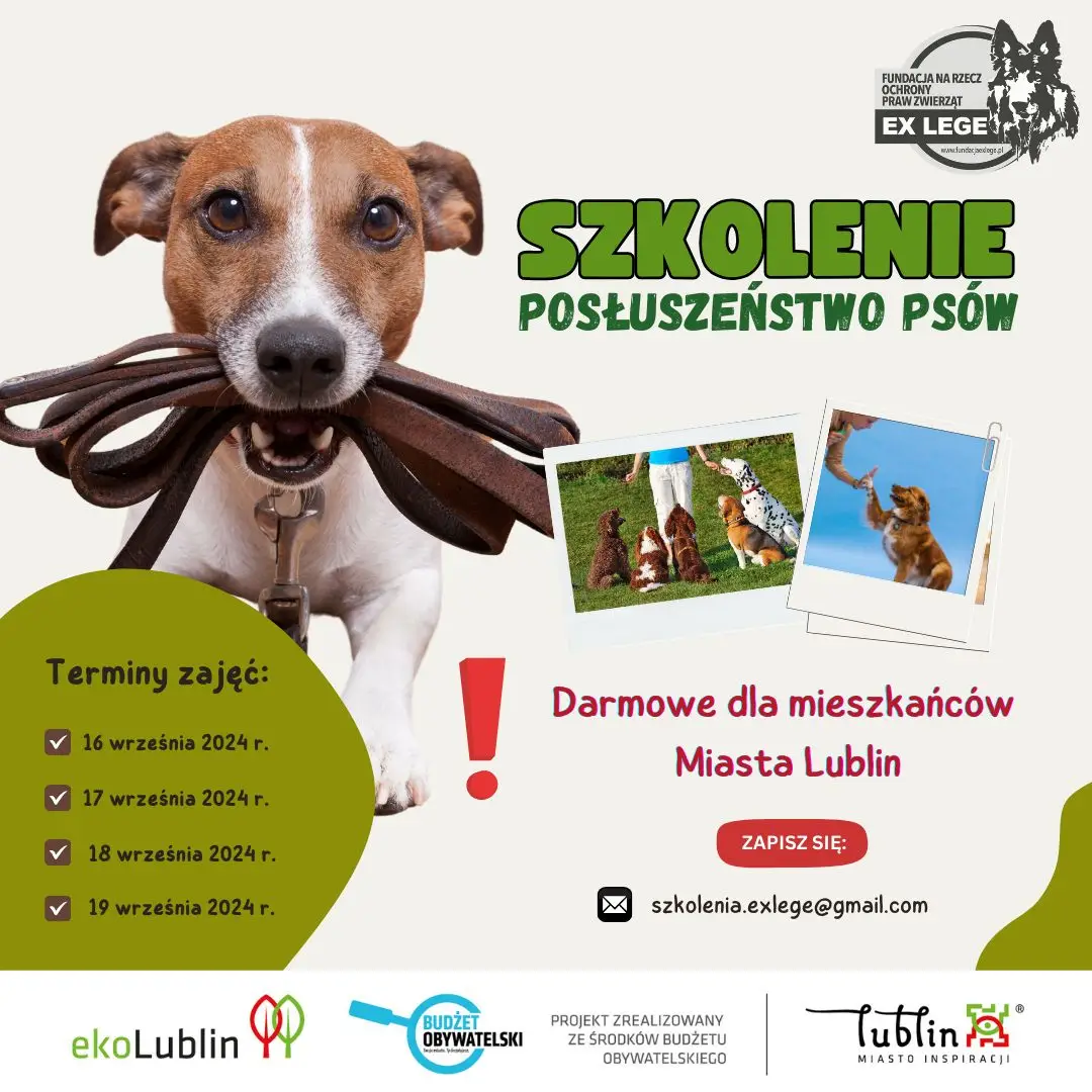 Fundacja EX LEGE zaprasza mieszkańców Miasta Lublin na NIEODPŁATNE szkolenia z zakresu posłuszeństwa psów. 🙋🐕🦺